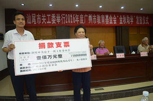 此次“金秋助学”活动得到广州市教育基金会、广东励志英才教育基金会的大力支持。为帮助家庭经济困难优秀学子顺利迈进大学校门,广东励志英才教育基金会常务副会长罗穆禧向广州市教育基金会捐赠100万元人民币,用于定向资助我市2016年和2017年参加高考、具有汕尾市学籍且家庭经济困难的200名优秀高考学生。
