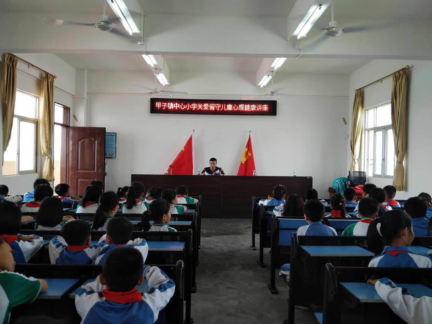 2019年4月24日上午,陆丰市甲子镇中心小学在学校综合楼会议厅为在校留守学生举行心理健康辅导活动。参加这次活动的学校各年级造册登记的留守儿童,共121名学生。镇党委刘谋副书记与镇总工会范伟培主席等领导亲自来校指导关爱留守儿童工作。