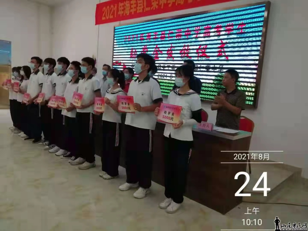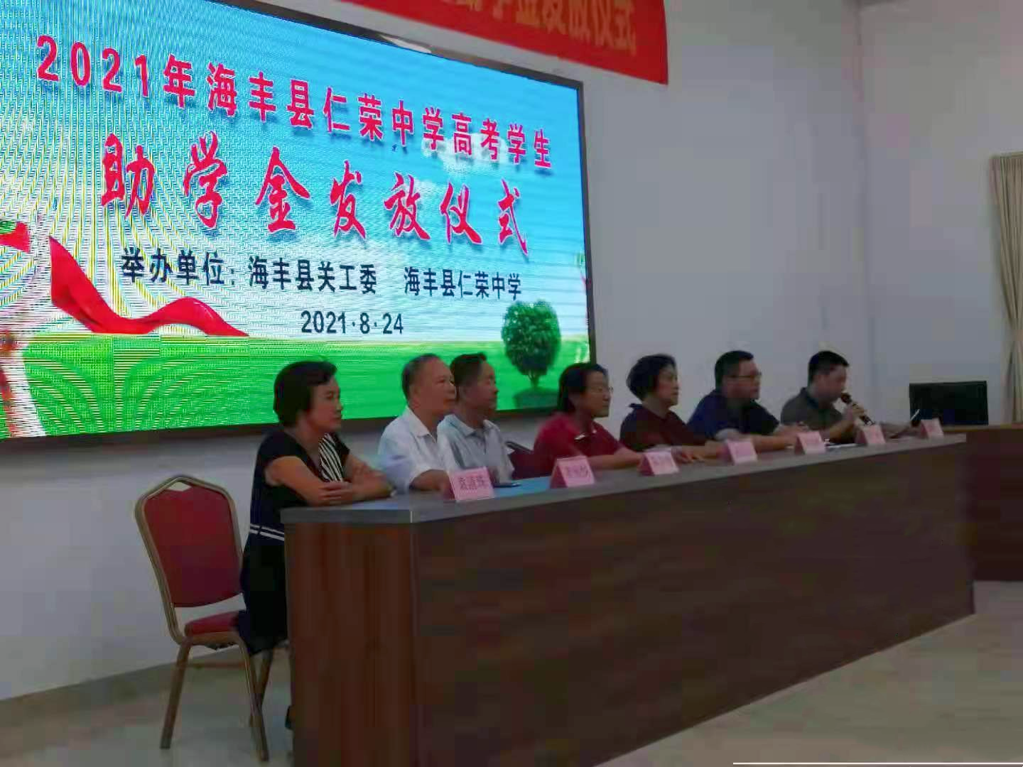 8月24日上午,海丰县关工委联合仁荣中学举行2021年高考奖助学金发放仪式。对该校郑映森等34名考上重点第一批的优秀学生和吴继显等25名优秀贫困生进行爱心资助,发放总额30多万元,资金全部由陈介仁先生赠助,海丰县关工委奖励优秀学生陈姿秀3000元。海丰县关工委副主任、办公室主任陈美度、李伙悦,海丰县仁荣有限公司、仁荣中学董事长陈介仁先生,出席发放仪式。